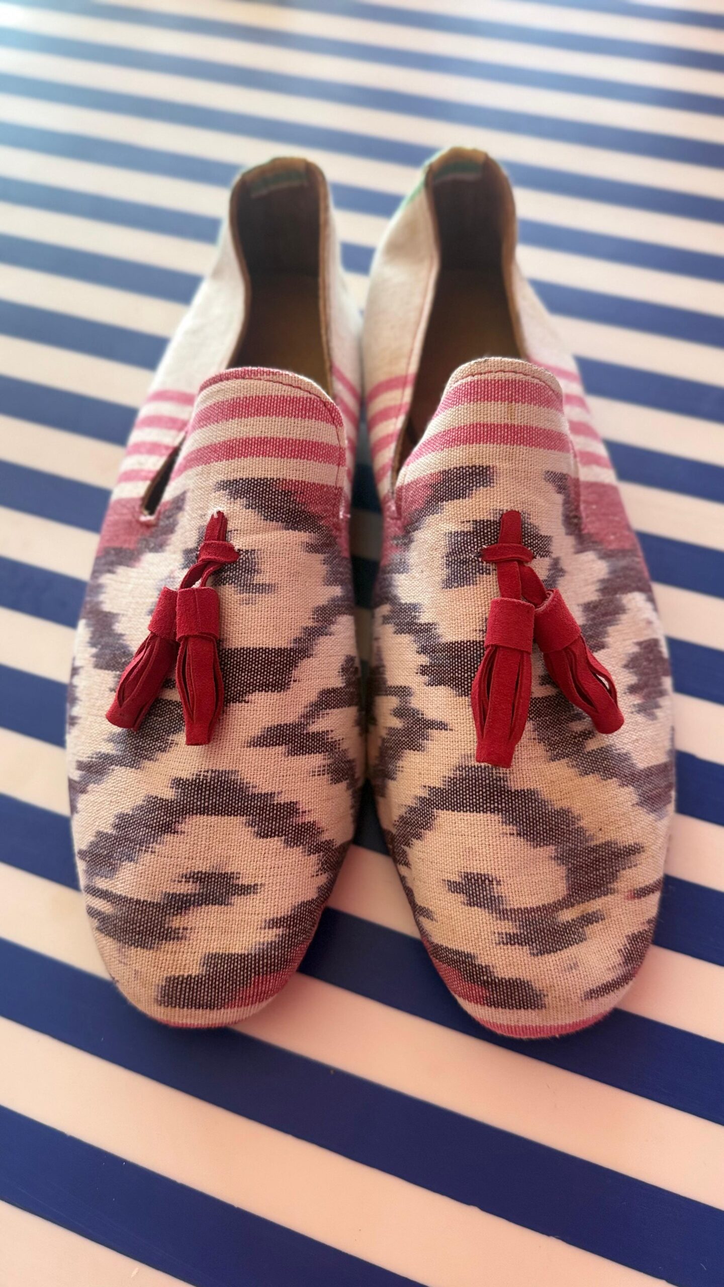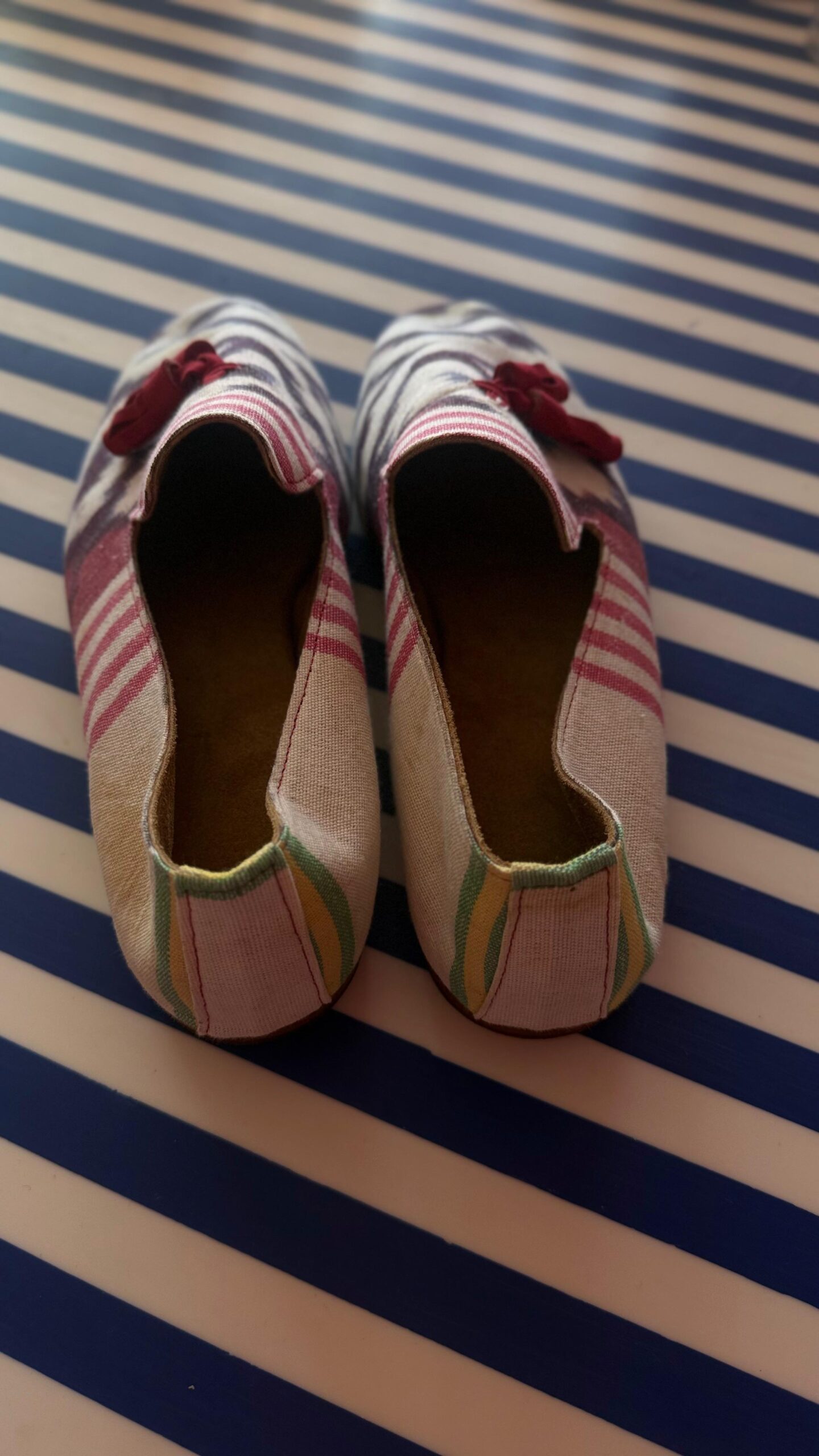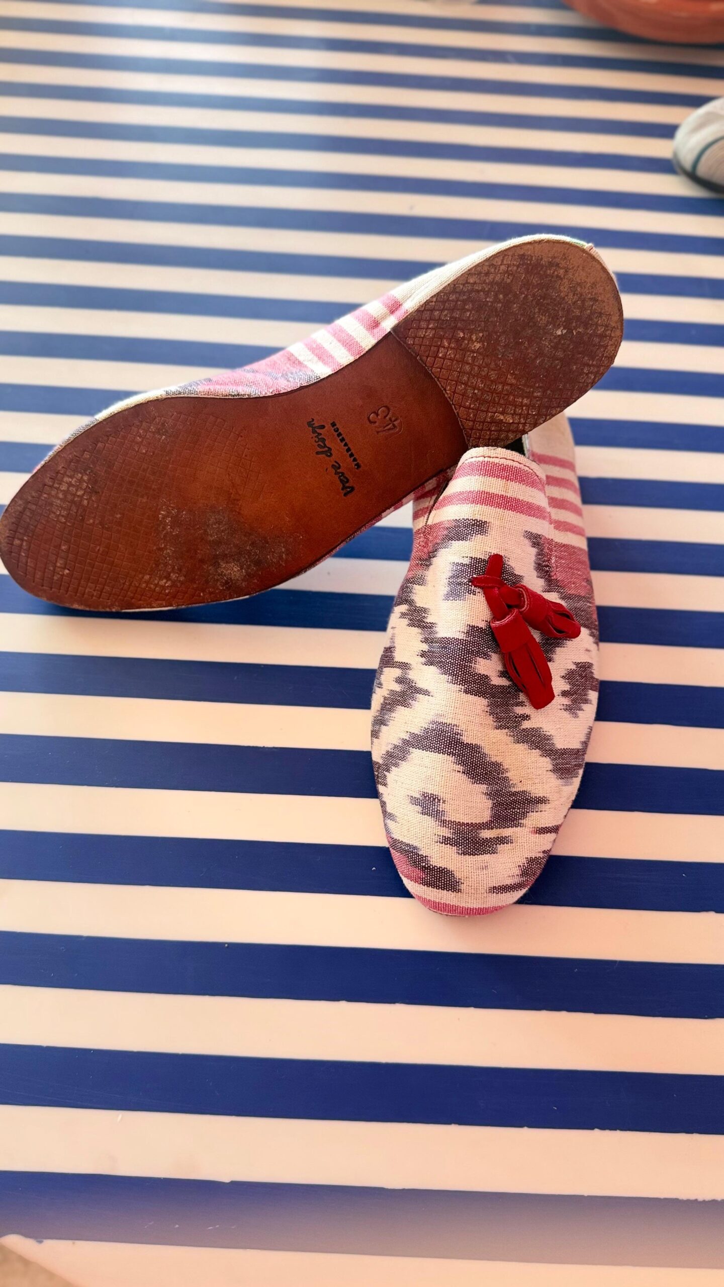Ces slippers en coton imprimé se distinguent par leurs motifs exclusifs et leur légèreté. Chaque paire est unique, conçue pour apporter une touche artistique et sophistiquée à votre look.
