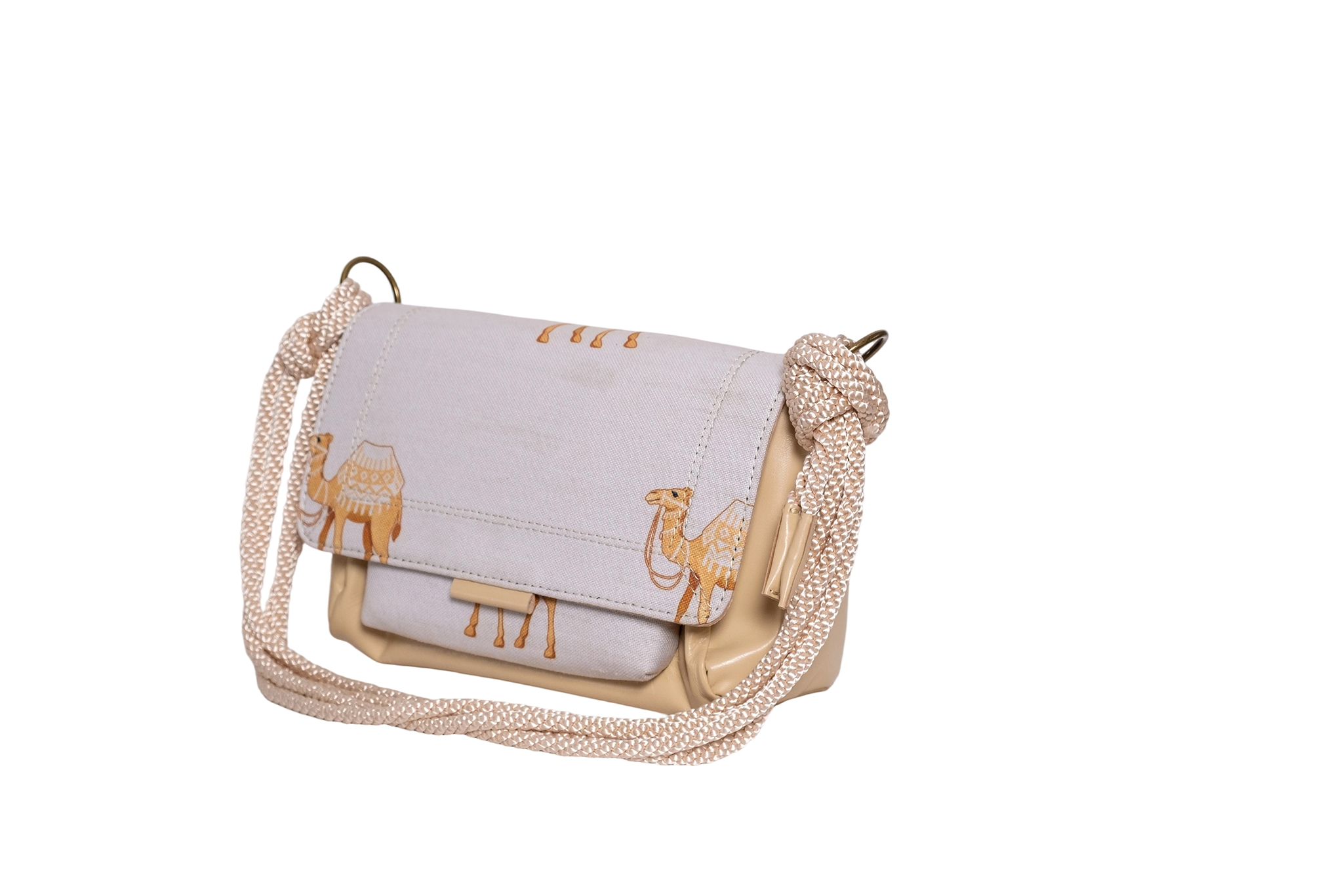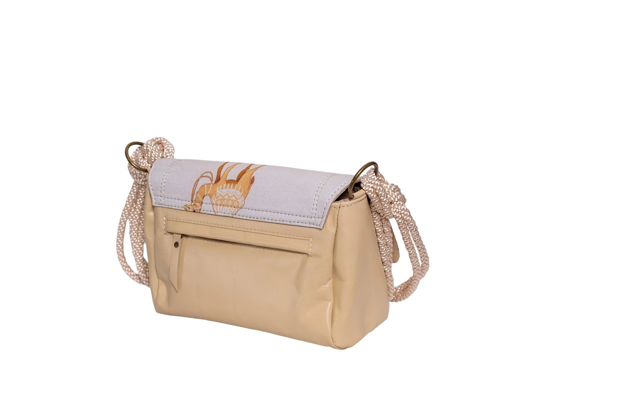 Leather and cotton bag with Moroccan dfira cord, button clip, small internal and external pocket, coordinates with coat, shoes, or trousers. One-of-a-kind piece, reproducible in different colors.