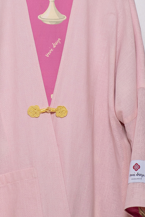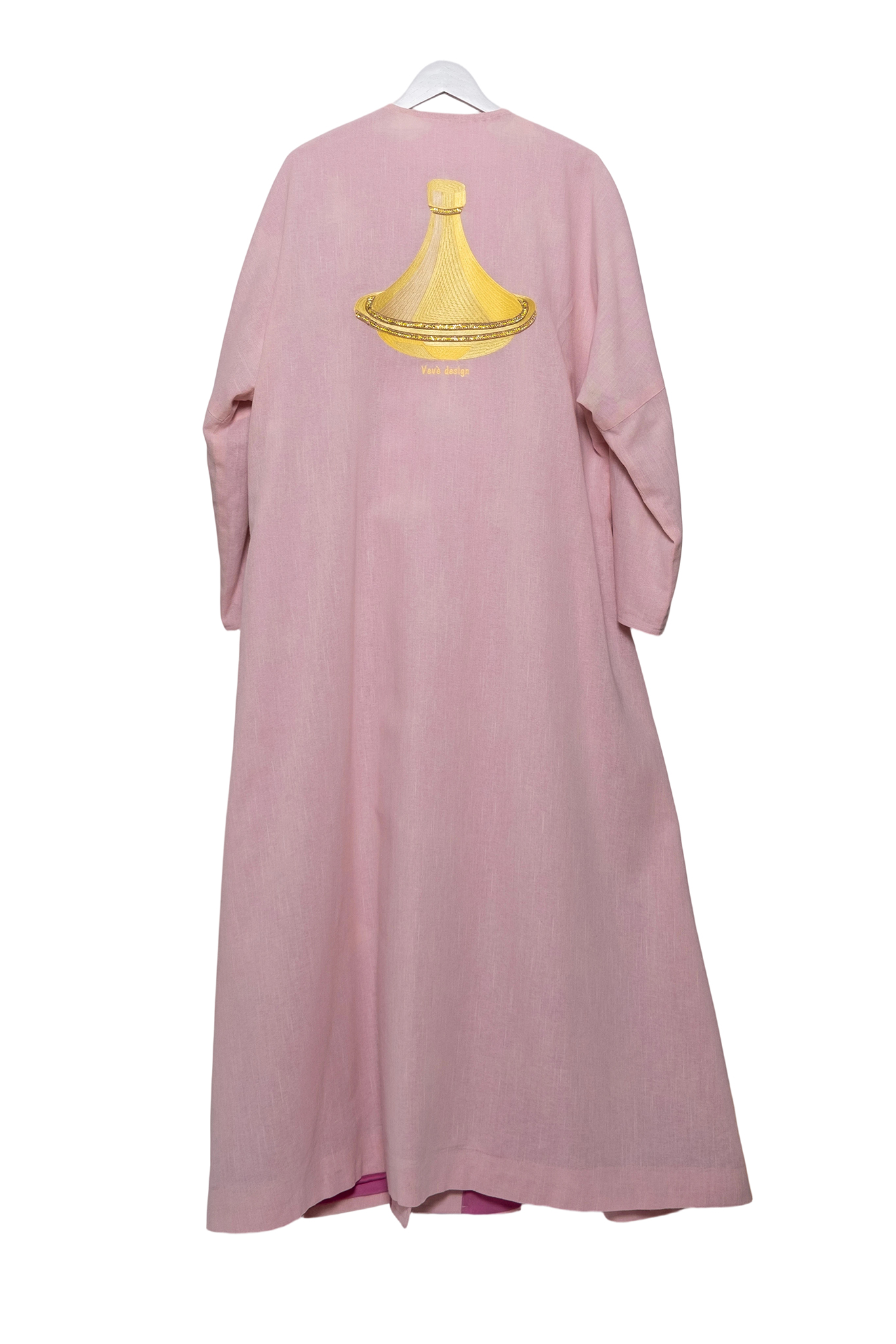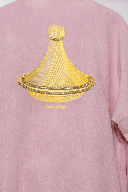 Long and large kimono in fuchsia linen, with large tajine embroidered on the back in Yellow pink and precious wall details, matching yellow lining with Moroccan tajine designs, single pocket with chuchia. Size m/l. Unique piece reproducible in all colors and cuts. With matching scarf for ijab. With trousers, shoes and matching bag.