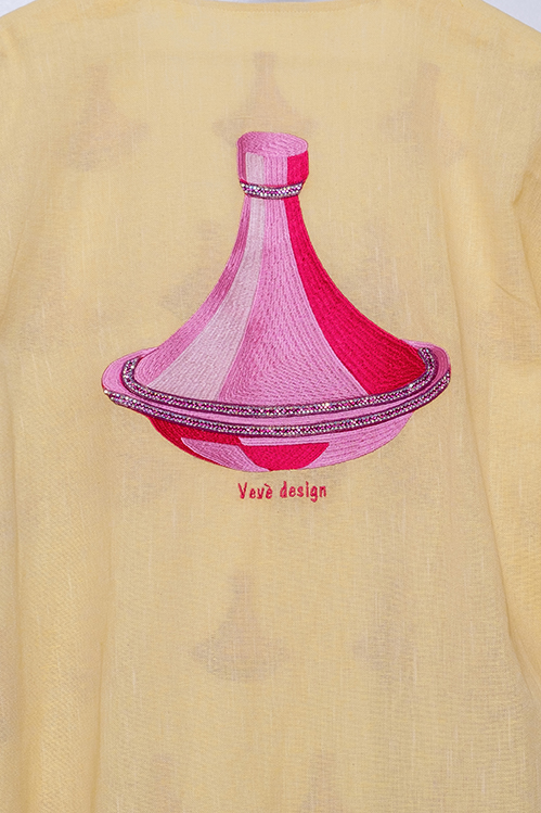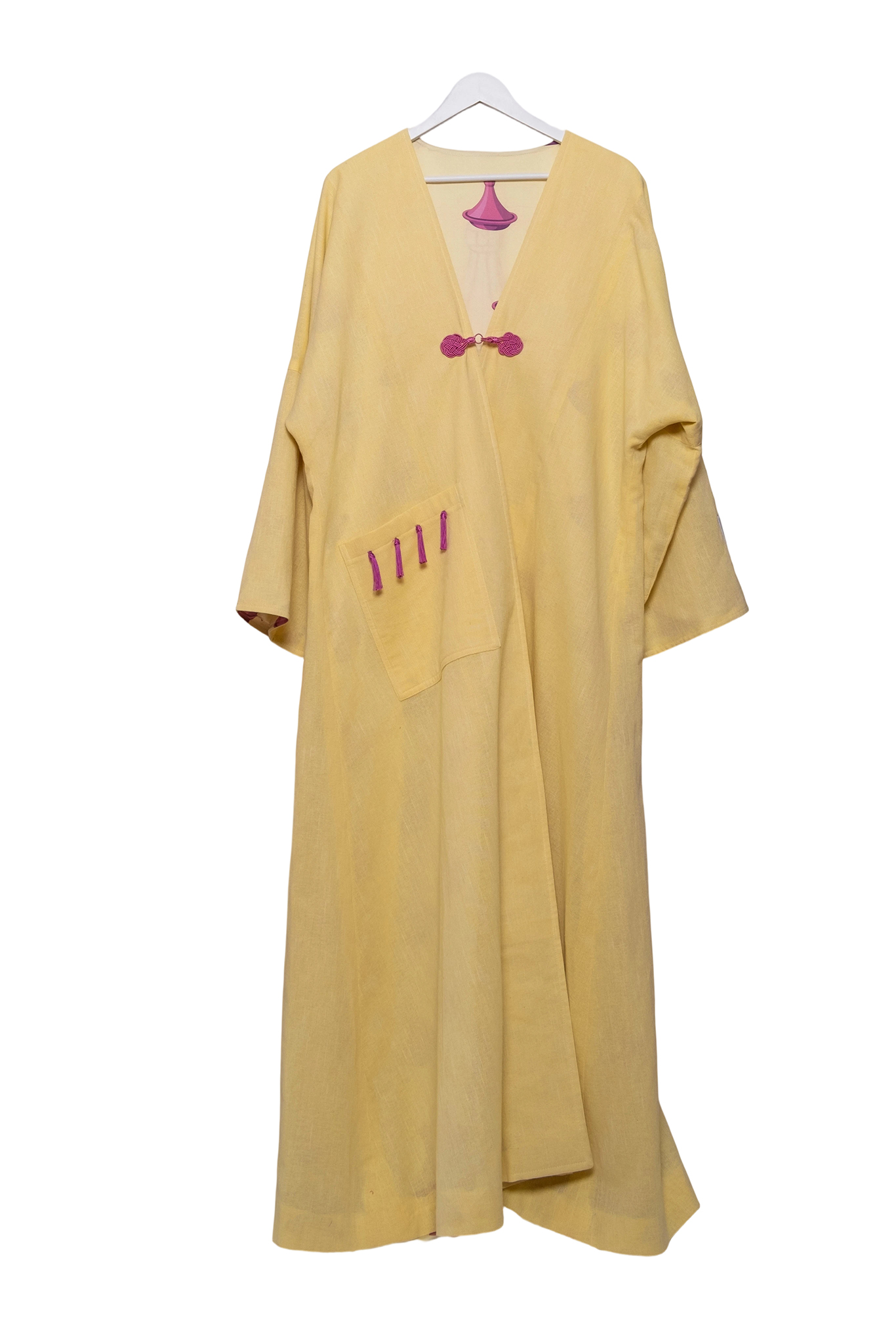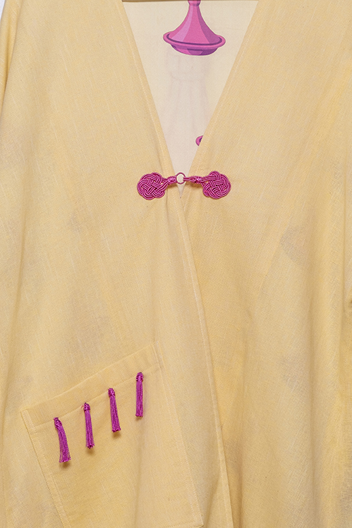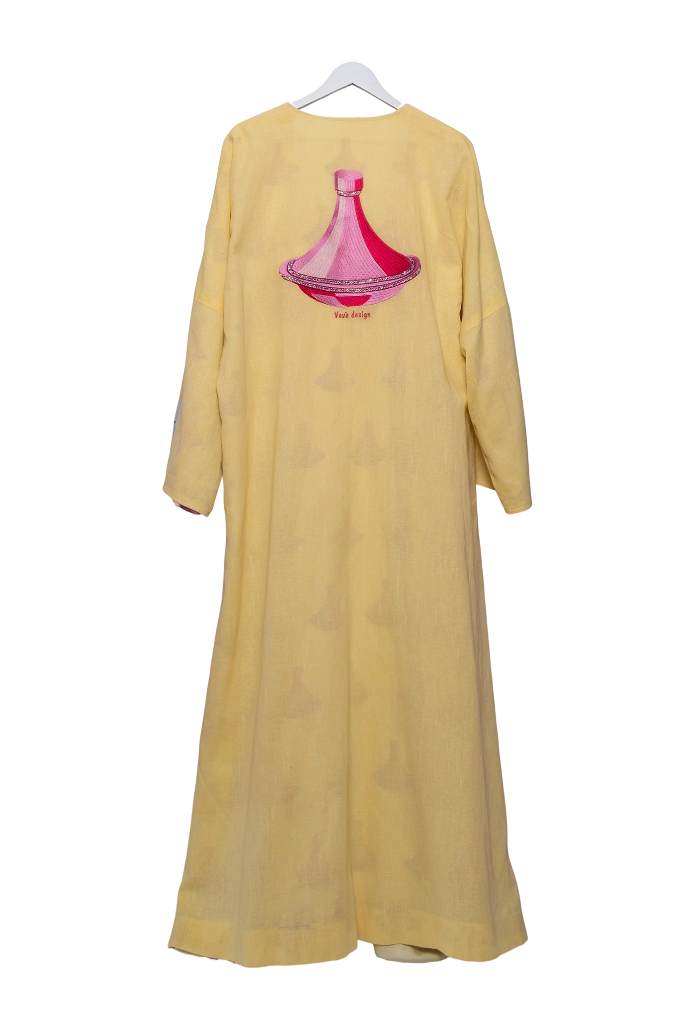 Long and large kimono in light yellow linen, with large tajine embroidered on the back in fuchsia pink and precious wall details, matching yellow lining with Moroccan tajine designs, single pocket with chuchia. Size m/l. Unique piece reproducible in all colors and cuts. With matching scarf for ijab. With trousers, shoes and matching bag.