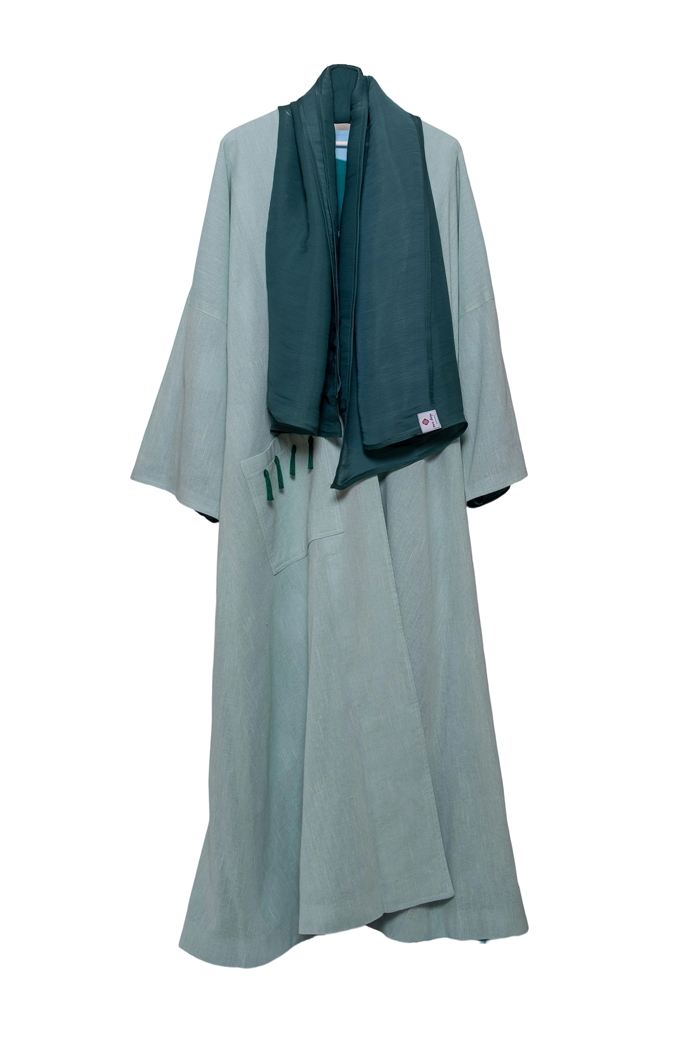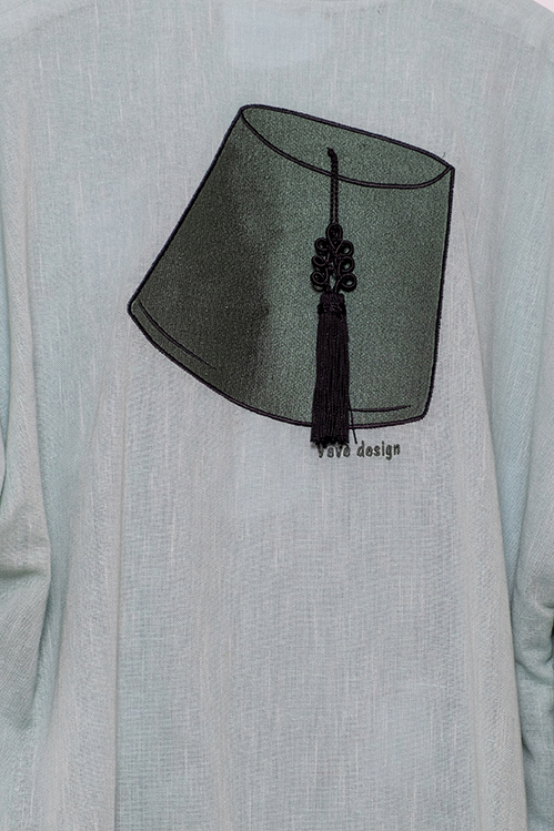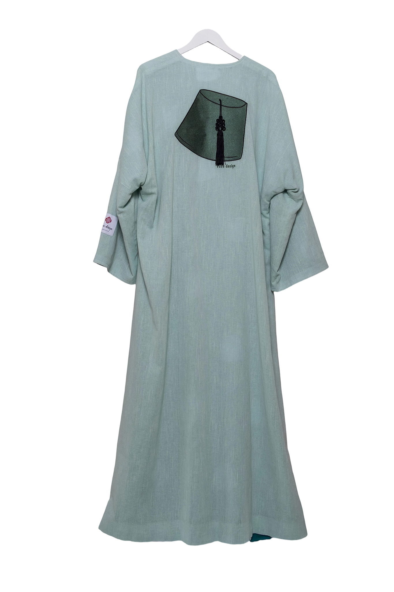 Long and large kimono in light aqua green linen, with a large embroidered tarabouche on the back and chuchia, lining with Moroccan tarbouche designs, a single pocket with chuchia. Size m/l. One-of-a-kind piece reproducible in all colors and sizes. With a matching scarf for the ijab. You can pair it with the matching trousers, shoes, and bag.