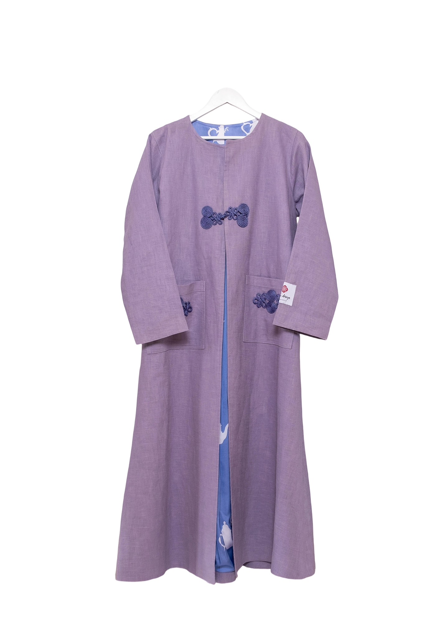 Linen trench coat with Moroccan teapot embroidery on the back, satin lining, that you can match with crepe trousers with teapot design. One-of-a-kind piece, available in all colors and sizes.