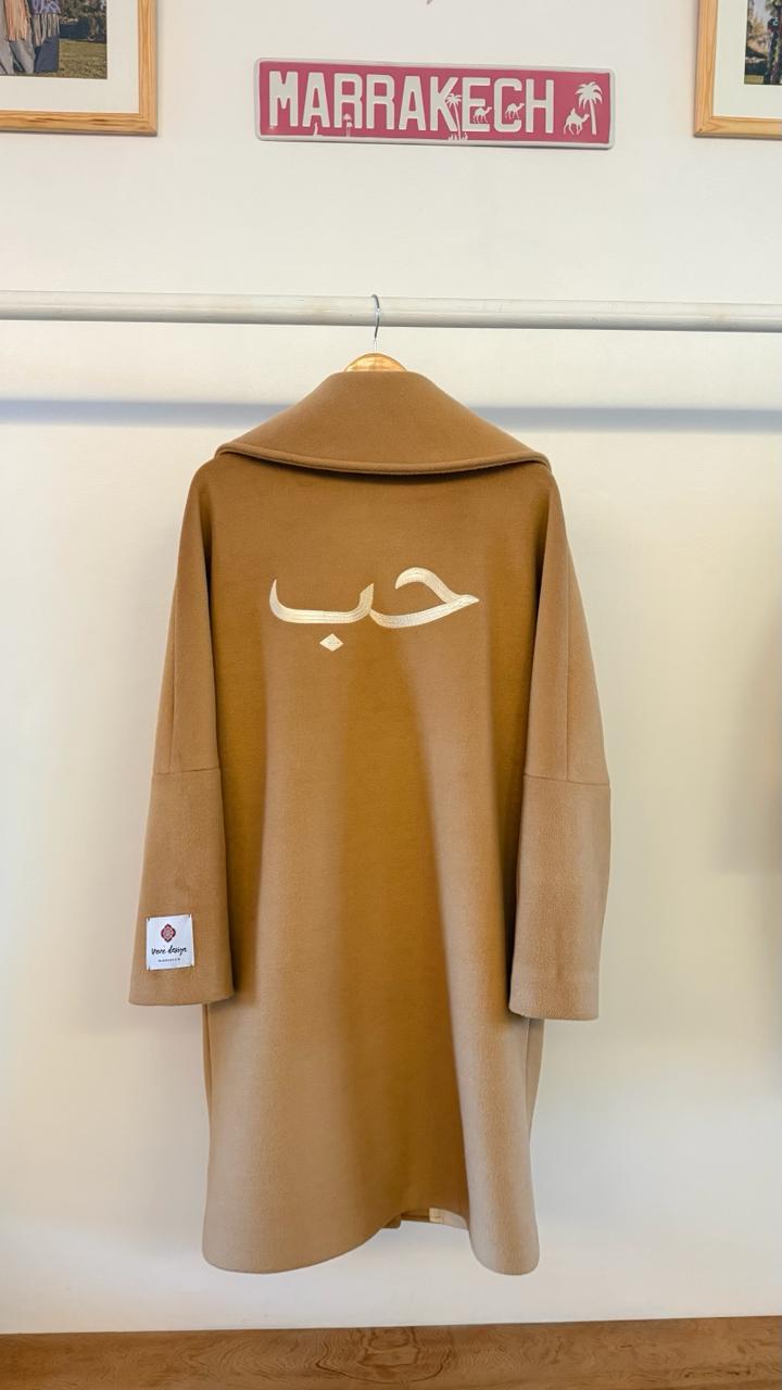 Sa teinte beige intemporelle s’associe à une doublure en satin de soie délicate, tandis que le détail calligraphique signature au dos apporte une touche distinctive et identitaire. Une pièce à la fois minimaliste et forte.